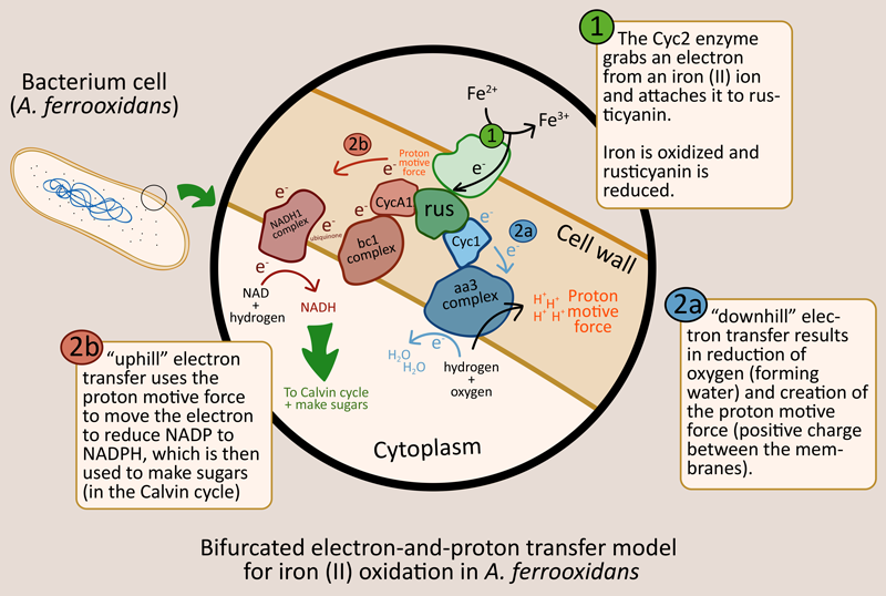[Beware: really interesting details follow] Electrons are first grabbed by the protein rusticyanin with the help of an enzyme called Cyc2. From there, there are two possible pathways the electron can follow (see figure below, it has pretty colors and arrows and stuff). The first pathway is called the “downhill” pathway because it does not require any extra force. Electrons are passed along until they reach an complex that hands them off to oxygen ions, in the process pumping hydrogen ions (H+) from the cytoplasm to the space between the two membranes.