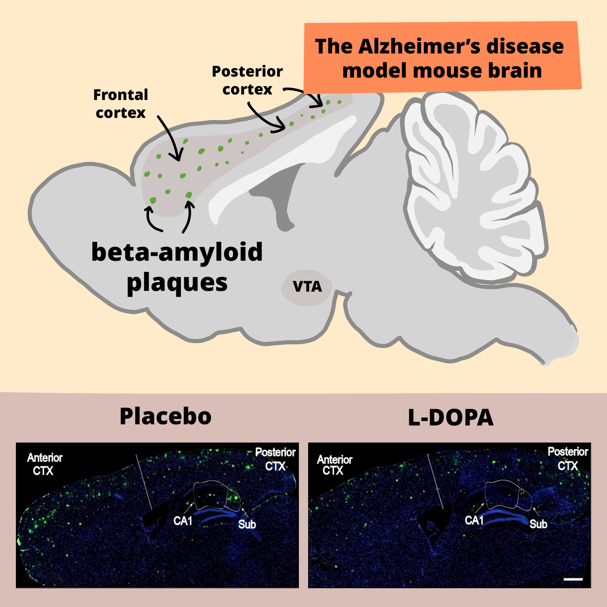 (Top) Schematic of the Alzheimer’s disease model mouse brain. Green dots represent amyloid-beta plaques. (Bottom) Experimental results after treating the model mice with placebo or L-DOPA for 3 months. Note the reduction in beta-amyloid (fluorescently labeled in green) in both frontal and posterior cortices after treatment.
